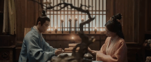 與樓垚退婚之前, 兩人曾經在同一片「有月亮」的夜空之下; 但是兩人中間隔了一道門, 以及這裡的畫面給的月亮是「水中月」 「鏡中花,水中月」 在中國文學裡常用來比喻虛幻的美好影像。 因此,也暗指著兩人的婚事有如鏡中花,水中月, 虛幻不可得, 終究是一場夢。 少商想藉著婚事與樓垚外放到一處無他人管束、自在生活的這一個美夢。